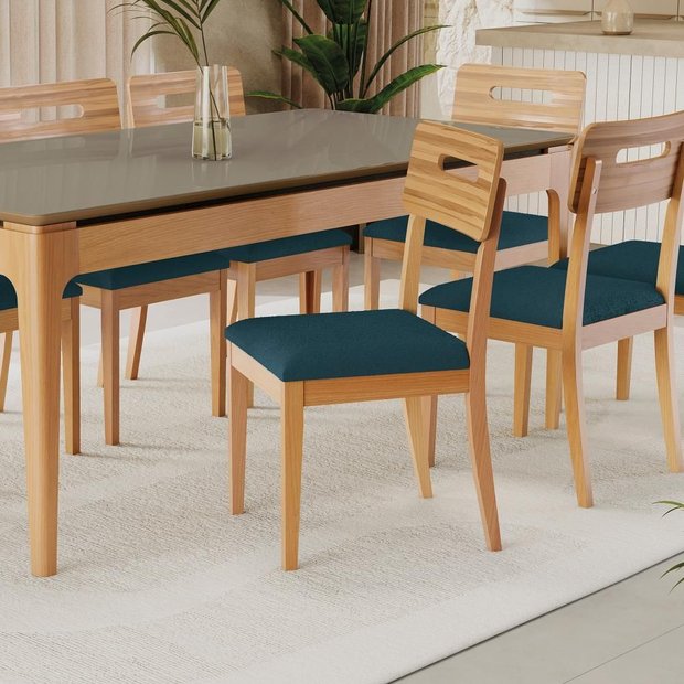 Tenha o máximo de estilo e comodidade em todos os momentos com a Cadeira Lila da Linha Sala de Jantar Premium da Kappesberg. Perfeita para compor seu ambiente com beleza e modernidade, ela é produzida em estrutura resistente, de madeira de eucalipto, garantindo mais durabilidade. Entregue montada e suportando até 120kg, ela combina com todas as ocasiões. Com medidas de 92cm de altura, sendo 49cm a altura do assento, 48cm de largura e 54,5cm de profundidade, para mais comodidade, o assento é estofado com espumas certificadas e recoberto com tecido bouclé azul, garantindo um toque suave e gostoso, deixando sua sala de jantar ainda mais completa. O destaque fica para o encosto, com formato oval, permitindo um encaixe perfeito com as costas, além do acabamento amadeirado e puxador, facilitando o manuseio e garantindo um acabamento único. Informações importantes: As imagens são meramente ilustrativas, não acompanha acessórios; A Tonalidade do produto pode variar conforme cada tecido; Este anúncio acompanha duas cadeiras em madeira maciça; O vídeo do produto pode ser genérico, então atente-se às imagens do anúncio para optar pela cor/modelo.