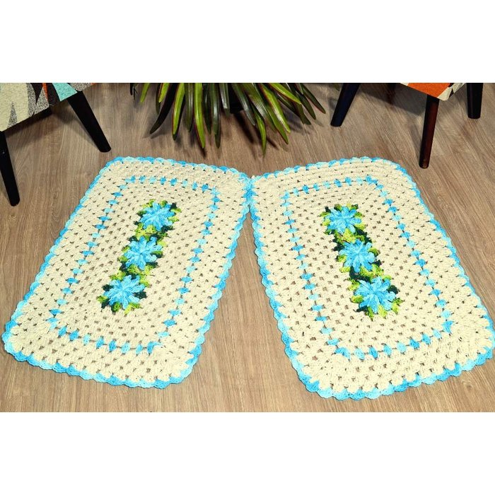 Par de Tapetes em Crochê Retangular Edith - Detalhes Azul Mesclado Arte & Tear Azul Mesclado