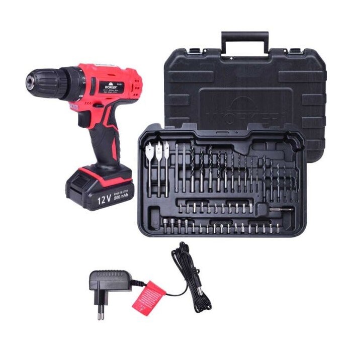 Parafusadeira Bateria Reversível 12v Worker + Kit 50 Peças