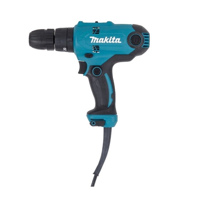 A Furadeira Parafusadeira de impacto 3/8" 320 watts velocidade variável e reversível - HP0300 da Makita apresenta mandril de aperto rápido, 2 velocidades mecânicas, botão de bloqueio embutido para uso contínuo e rotação reversível para desparafusar.