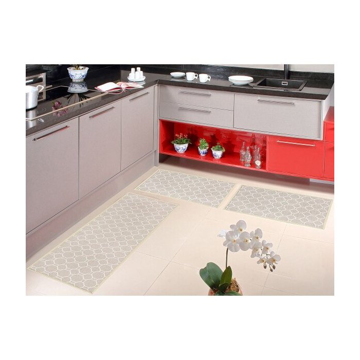Nossos Tapetes irá deixar sua cozinha mais bonita e moderna. Além de complementar com o restante da decoração, o item proporciona uma atmosfera mais aconchegante ao local. Pois a Cozinha é um dos ambientes em que há mais circulação dos moradores e de visitas. Itens Inclusos: 01 - Passadeira Antiderrapante 40cm x 1,20m 02 - Tapetes Antiderrapante 40cm x 60cm Composição: 100% Poliester
