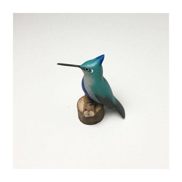 Figura animal pássaro em madeira, pintado nas cores cinza, preto, azul e verde, sob uma base com seção de tora em madeira natural. Assemelha-se ao animal real devido a riqueza de detalhes e a construção das formas por meio de entalhes precisos e minuciosos.