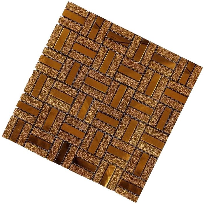 Transforme seus ambientes com esta pastilha decorativa feita de vidro verdadeiro, combinando brilho, textura e um visual moderno. O design em padrão geométrico cria um efeito visual sofisticado, com peças retangulares em tom dourado e detalhes texturizados que adicionam profundidade e requinte.