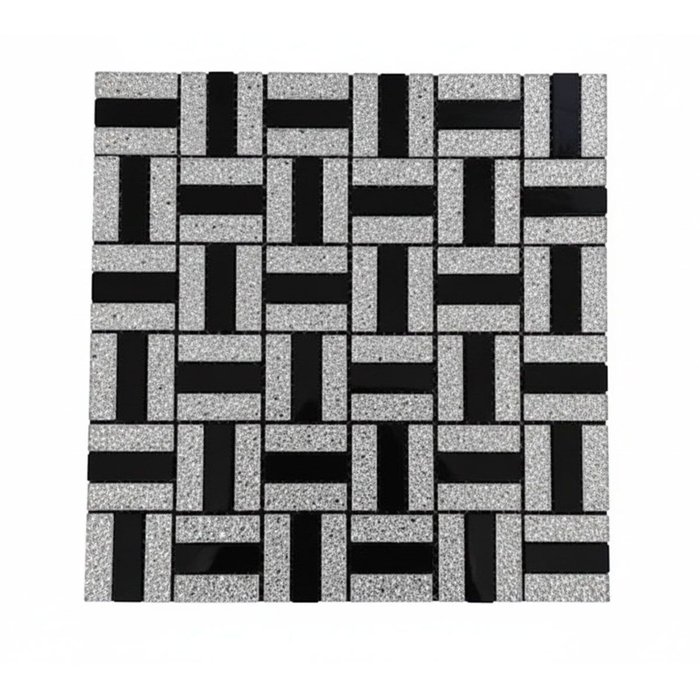 Transforme seus ambientes com esta pastilha decorativa feita de vidro verdadeiro, combinando brilho, textura e um visual moderno. O design em padrão geométrico cria um efeito visual sofisticado, com peças retangulares em tom prata e preto e detalhes texturizados que adicionam profundidade e requinte.