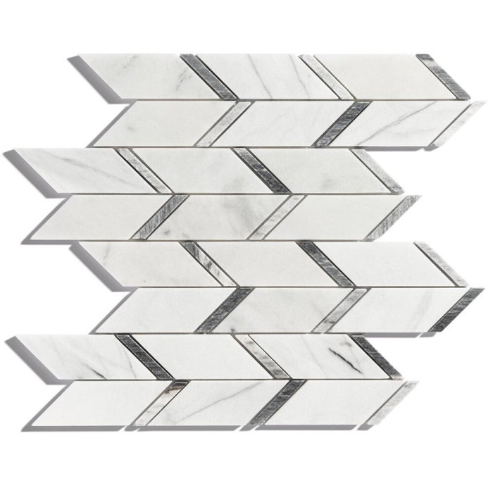 As Pastilhas de Pedra Chevron (Mármore Piguês e Grey) são fabricadas a partir da composição de duas pedras naturais, sendo a principal o Mármore Piguês e secundária como detalhes, o Mármore Grey. O Mármore Piguês tem como característica marcante um fundo mais cremoso com uma variação de manchas cinzas por toda a sua extensão, tornando a padronagem dessa pedra natural uma verdadeira exclusividade. Sendo uma composição clara, essa pastilha é muito versátil e atemporal, podendo ser utilizada para compor a decoração em banheiros, cozinhas ou alas sociais, conferindo requinte ao ambiente. Por se tratar de uma pedra natural, cada peça é diferente, apresentando tonalidades e veios únicos. Este modelo é composto por pastilhas no formato chevron, de Mármore Piguês e detalhes em Mármore Grey.
