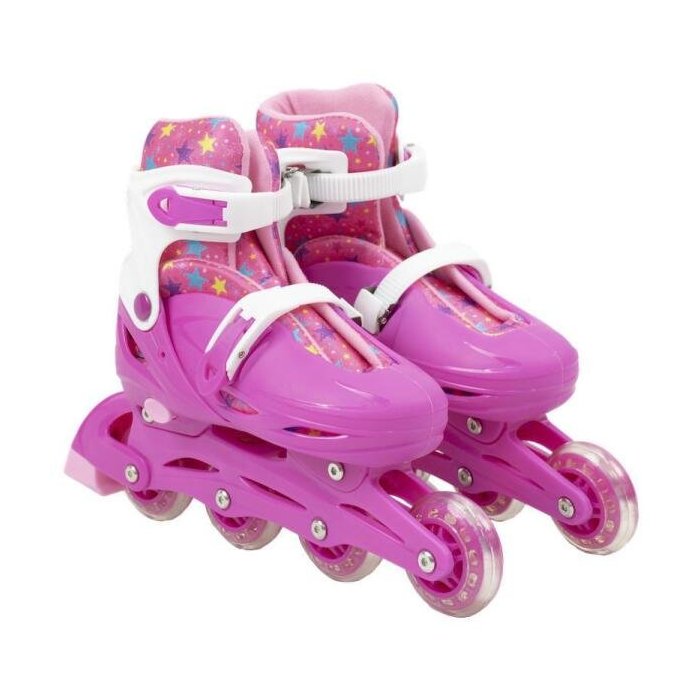 Kit patins infantil in line e tri line com kit de segurança tamanho 36/39 rosa bbr toys Kit: par de patins com 3 ou 4 rodas, com um capacete, par de joelheiras e um par de cotoveleiras. Rodas traseiras flexíveis, ajustável, com rodinhas de apoio e freio em apenas um dos lados. Código INNAC 00160-13A