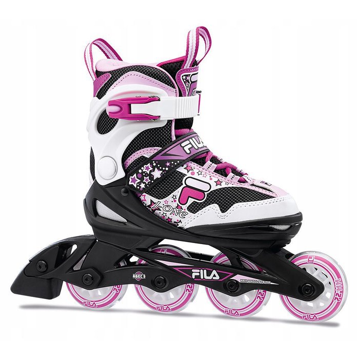 Patins Infantil Patins J-One Girl Fila Skates Leve e fácil de usar, ele adapta-se ao pé em crescimento, com ajustes que permitem total segurança. Também ajustáveis quando o patins está sendo usado. A melhor opção para crianças e adolescentes. - BASE: Composite - 4 rodas - CUFF: Alto - FECHAMENTO: Fivela e cadarço - BOTA: Veludo respirável - RODAS: Fila: 80mm/82A - ROLAMENTOS: ABEC 5 - CORES: Rosa/Branco - TAMANHO P: 26 ao 30 (Ajustável) - TAMANHO M: 30 ao 34 (Ajustável) - TAMANHO G: 34 ao 38 (Ajustável) - Peso Líquido: Aproximadamente 2,140kg - Suporta até 60kg