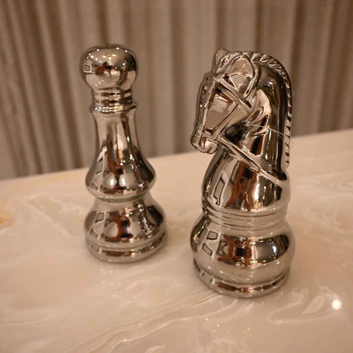 As Peças de Xadrez saíram do tabuleiro e viraram peças de decoração. As peças de Xadrez na decoração são elaboradas detalhadamente, trazendo todos os detalhes das peças desse jogo tão distinto para a decoração do seu ambiente. O Cavalo em sua simbologia, é a única peça do jogo que pode pular sobre as outras peças, tanto suas, quanto adversárias, para chegar no objetivo, representando movimento, estratégia e elegância. E o peão, por sua vez, só pode andar para frente, nunca para trás, representando força coletiva e potencial para evolução. Produzidas em Cerâmica, são peças resistentes, na cor prata combina com qualquer decoração já existente.