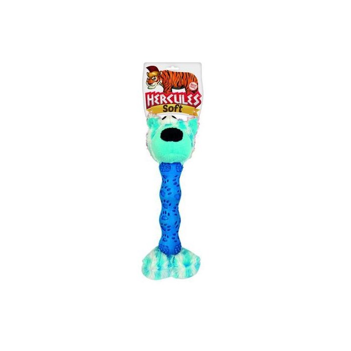 A cabeça possui apito e o corpo é feito de borracha texturizada macia.