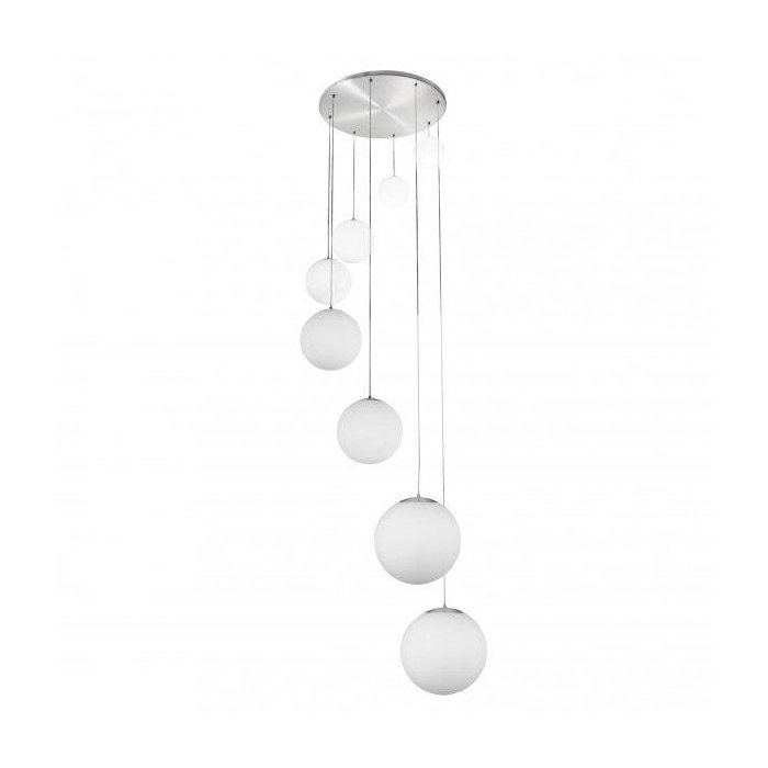 Produzido no sistema triplex, três camadas sobrepostas com espessura única. Estrutura de alumínio escovado com oito esferas feitas em vidro leitoso fosco acetinado, que proporcionam bom potencial de iluminação sem perder a suavidade. O pendente Esphera é bivolt, que proporciona versatilidade, fazendo desta uma peça indispensável para sua decoração.