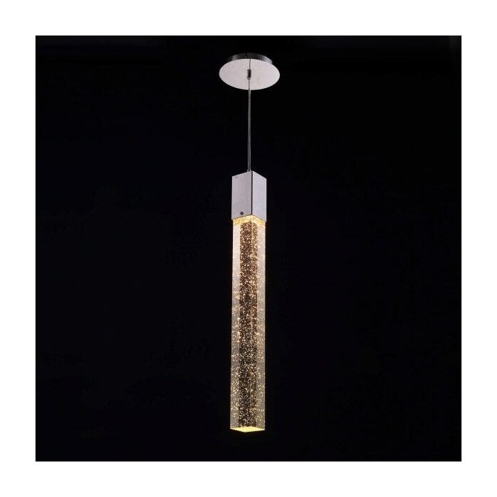 Pendente tubo quadrado H- 61,5cm H- 50cm, Vidro "Bolha" transparente, acabamento em aço cromado, para 01 lâmpada GU-10 até 50W ou LED. Pendente moderno e sofisticado, uso indicado em cabeceira de cama e lavabo.