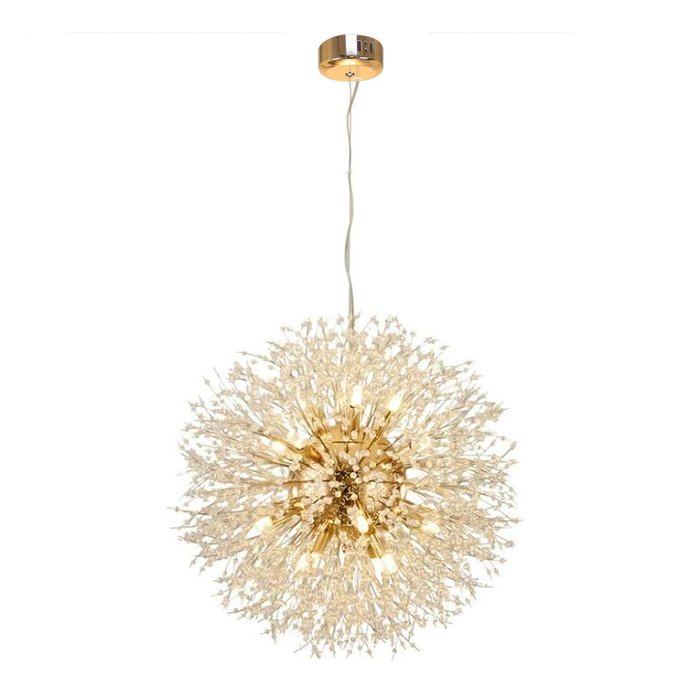 Design: Formato esférico com cristais pendentes, criando um efeito visual único e elegante, semelhante a um dente de leão.