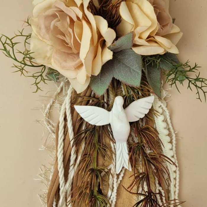 O Pendente Espírito Santo é uma peça artesanal única, medindo 44x20cm. Ele é confeccionado com barbantes, fitas e cordões variados, todos em tons suaves de nude, creme e bege claro, que criam uma atmosfera delicada e serena. O pendente é adornado com flores creme e pequenos verdes outonais, que adicionam um toque de frescor e elegância à peça. No centro, o Espírito Santo é destacado, simbolizando proteção e espiritualidade. Este pendente é perfeito para decorar ambientes com um toque sutil e sofisticado, ideal para quem busca uma decoração com significado e beleza.
