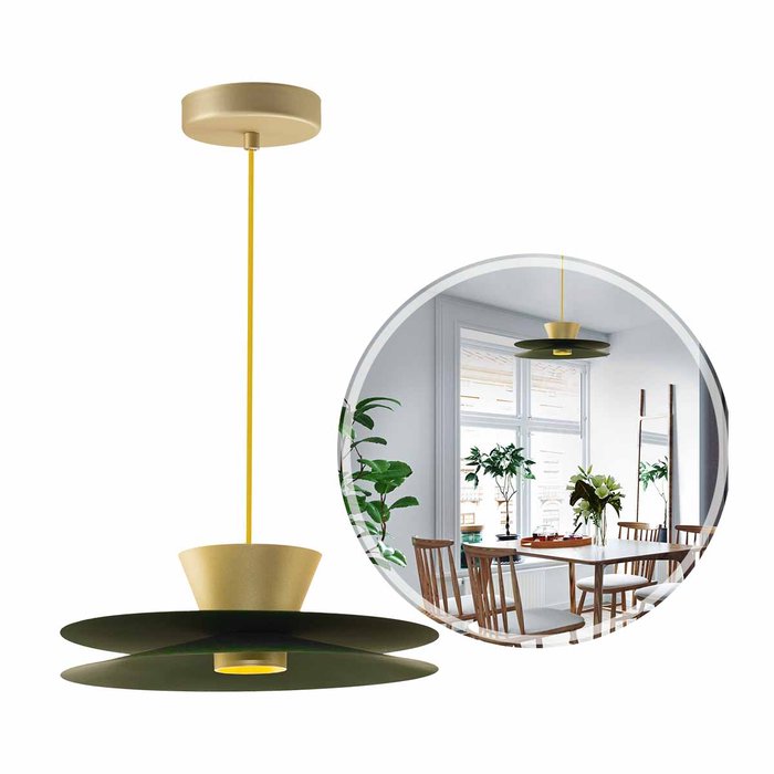 Apresenta um design contemporâneo em alumínio, destacando-se pela combinação de cores verde e dourado, que adiciona um charme único ao espaço.