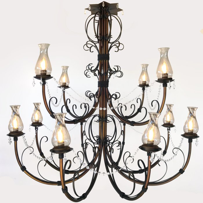 Pendente Rústico Para Salas Com Cúpulas de Vidro e Cristais: 8 bocais na parte de baixo e 4 na parte de cima.