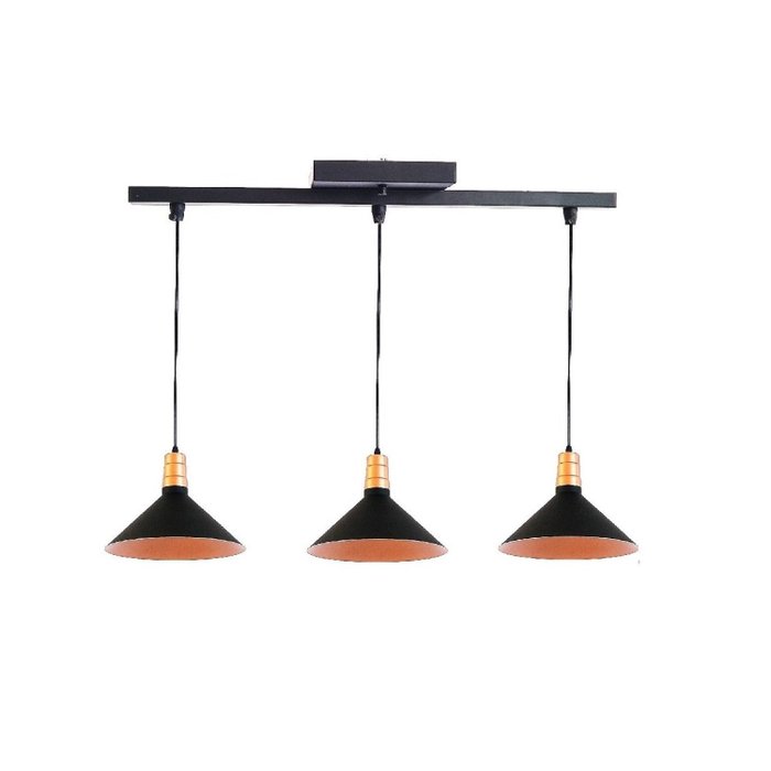 Pendente Trilho/3 Chapéu Pequeno, 3 lâmpadas, referência 2738, cor preto/cobre. Seu design moderno permite a utilização deste produto em diversos ambientes internos como para quarto, sala de estar e de jantar, cozinha, espaço gourmet, salão de festas, escritório, comércio e varanda. Pode ser usado também em ambientes externos, desde que fique ao abrigo do sol, da chuva e da umidade. Informações Técnicas: Cor: Preto/Cobre - Dimensões do produto: 14 cm altura - 13 cm diâmetro canopla – 22 cm de comprimento - Cabo PP 1m - Trilho/2 com 5 cm de espessura e 46 cm de comprimento. Tipo de Soquete: E27 - BIVOLT (110/220V). Quantidade de Lâmpadas: 03 LED ou PAR20 - Potência máxima 20W - Não acompanha Lâmpada - Não possui LED integrado - Não necessita montagem - Fácil instalação. Material: Alumínio - Garantia 90 dias após emissão da nota fiscal ao consumidor