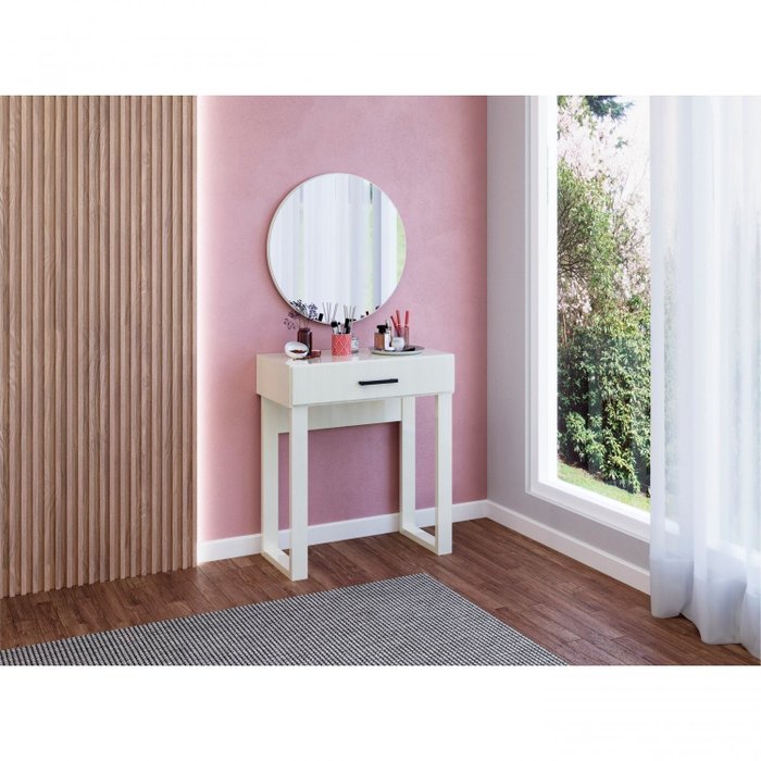 Penteadeira 1 Gaveta 67,5x76cm com Espelho Redondo 60cm Industrial Dalla Costa Off White Brilho
