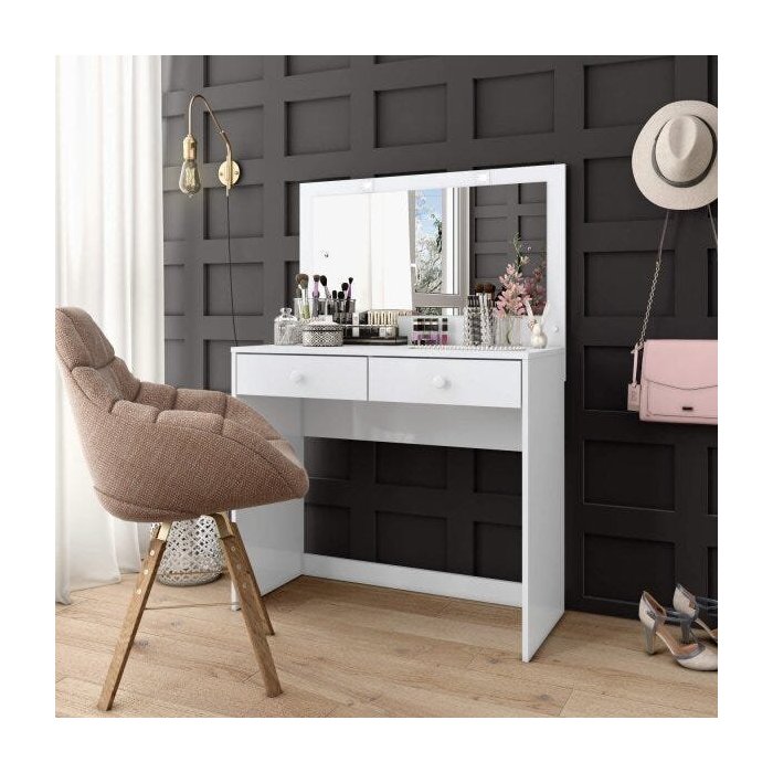 A Penteadeira Thais foi produzida pensando em suprir a demanda da mulherada que gosta de passar horas na frente do espelho se embelezando, desta forma com o auxílio deste produto este processo vai se tornar ainda mais prático. O produto foi elaborada em MDP com 1.330 mm de Altura, 910 mm de Largura e Profundidade de 415mm, sendo que a mesma possui duas gavetas com corrediças metálicas que vão garantir mais segurança durante o manuseio, dispõe também de 02 luminárias com 02 leds que vão auxiliar durante a utilização da mesma e por último mas não menos importante está a aplicação de um espelho nas dimensões de 800 mm de largura por 400 mm de altura e 03 de profundidade.