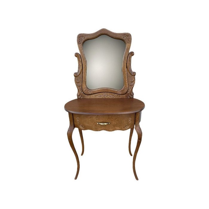 A superfície da penteadeira é ampla, ideal para acomodar espelhos, produtos de beleza e acessórios pessoais, enquanto as pernas são esculpidas de maneira graciosa, proporcionando estabilidade e um visual sofisticado. A combinação de texturas e os detalhes entalhados trazem um ar de vintage e charme, tornando a penteadeira não apenas um local prático para se arrumar, mas também um elemento decorativo que enriquece o ambiente.