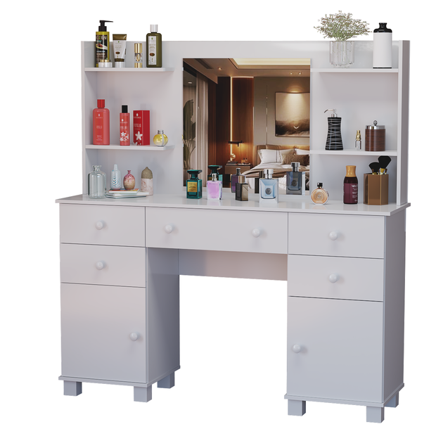 Amplo Espaço de Armazenamento: 5 gavetas + 2 portas + prateleiras laterais para organizar maquiagem, perfumes, joias e acessórios.