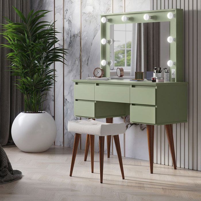 interruptor e banco. Não contém lâmpadas. Descrição do produto: Altura: 152,2 cm Largura: 120 cm Profundidade: 45 cm Informações do produto: Cor: Alecrim Espelho: Sim (1) Pés: Sim (4) Gavetas: Sim (5) Soquetes: Sim (8) Interruptor: Sim (1) Material: MDF Itens inclusos: 01Penteadeira Camarim com Banqueta. Kit completo para montagem, manual detalhado de instruções para montagem. Garantia: 3 meses contra defeito de fabricação. Informações complementares: - Fotos meramente ilustrativas do produto no ambiente. - Os objetos que ambientam as fotos não acompanham o produto; - Verificar descrição e tamanho do produto antes da compra. - Avaliar a mercadoria no ato do recebimento e recusar em caso de divergência ou danos. - Mantenha as informações de contato e endereço de entrega atualizados para entrarmos em contato caso necessário. - Limpar com flanela ou pano macio seco, não utilizar produtos abrasivos, desengordurantes, álcool ou solvente. Não expor o produto diretamente à luz solar e à umidade. * Sugerimos a contratação de um montador profissional para a montagem do produto. Não nos responsabilizamos por avarias causadas no ato da montagem. * Não nos responsabilizamos pela montagem e desmontagem do produto no ato da entrega e devolução, assim como os custos gerados nestas situações. * A transportadora entregará o produto no andar térreo do endereço de entrega. * Não nos responsabilizamos por subir escadas, corredores e elevadores ou transporte por guincho em apartamentos.