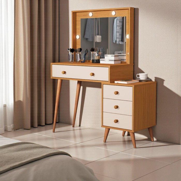 Penteadeira Camarim Ágata 4 Gavetas Espelho Luz Led Pés Madeira Maciça:nature/off White