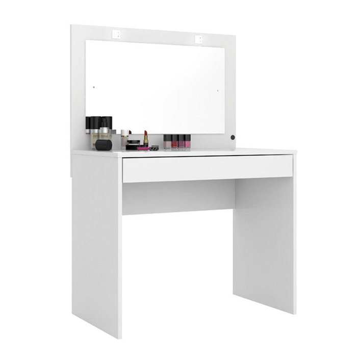 Móvel prático e adequado para pequenos espaços oferecendo um amplo espelho com iluminação em LED para maquiagem, gaveta central com corrediças telescópicas e estrutura principal em chapa de 18mm.