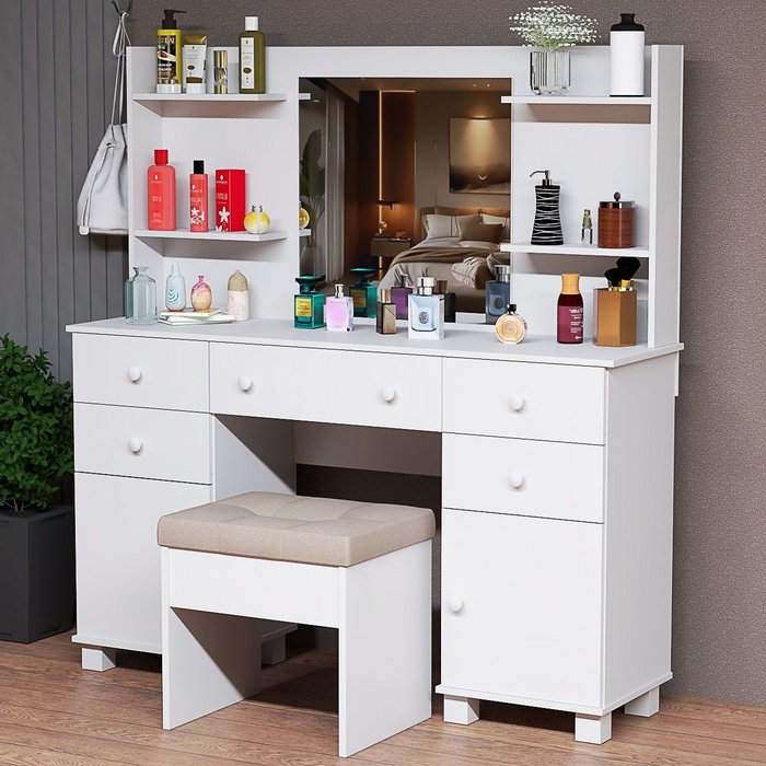 Amplo espaço de armazenamento – múltiplas gavetas, portas e prateleiras ajudam a manter tudo organizado.Colmeia funcional – ideal para separar pequenos itens como batons, pincéis e acessórios.Banqueta estofada em suede – conforto garantido para longos momentos de autocuidado.Design elegante e moderno – acabamento branco que combina com diversos estilos de decoração.