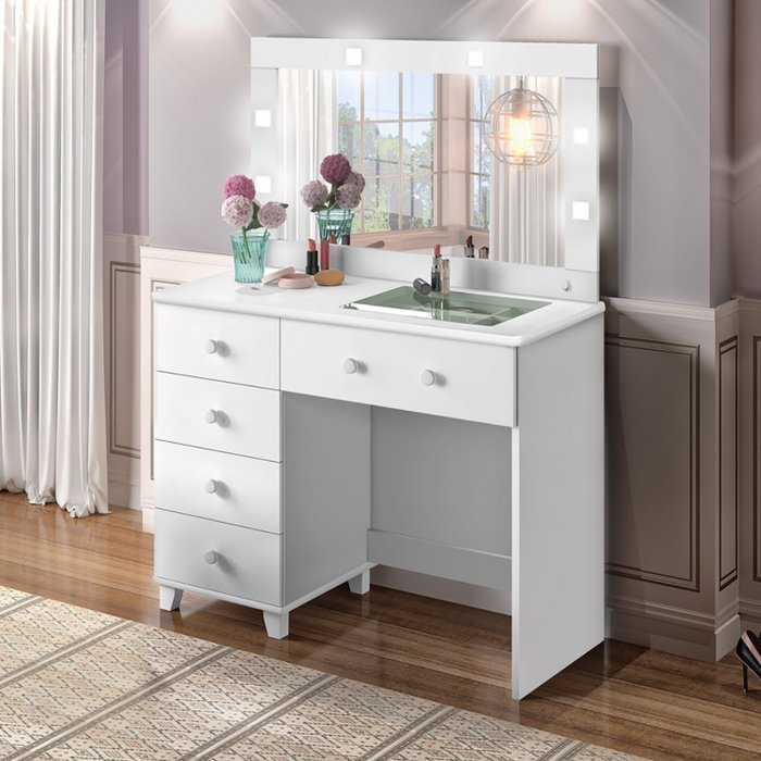 Penteadeira Camarim com Espelho e LED 5 Gavetas Branca Lara Móveis Branco