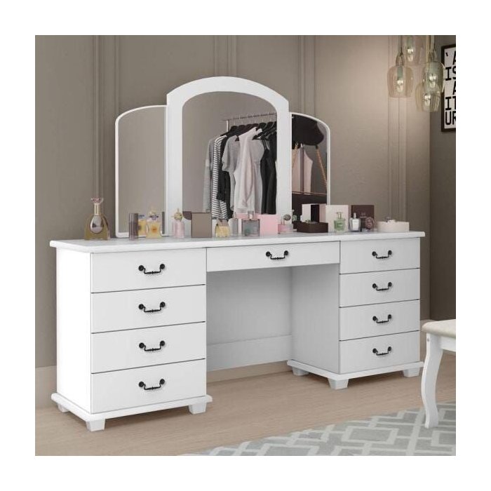 CaracterísticasItens inclusos: 1 PenteadeiraDimensões da penteadeira: Largura 1,60M; Profundidade 0,45M; Altura 1,70M.Descrição TécnicaMaterial: 100% MDFCom espelhoEspelho laterais com dobradiças 9 Gavetas com puxadores retroGaveta com Separador de JóiasComplexidade da montagem: Média, pode ser montado por apenas uma pessoa e/ou necessite de maior conhecimento para montagemRecomendações de uso, manutenção e limpeza: Limpar com flanela ou pano macio seco, não utilizar produtos abrasivos, desengordurantes, álcool ou solvente. Não expor o produto diretamente a luz solar e à umidadeGarantia: 3 mesesOBS: Foto meramente ilustrativa, decoração não faz parte do produto.