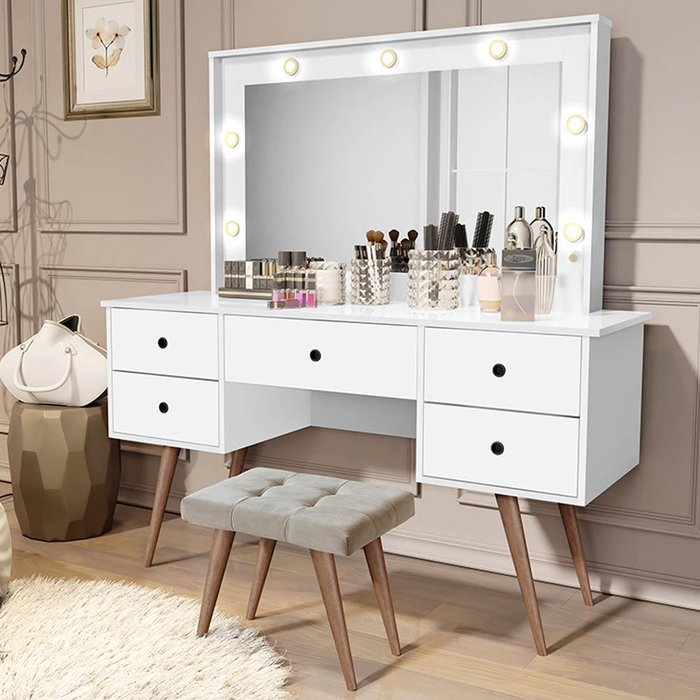 Dimensões da penteadeira: Largura 1,36M; Profundidade 0,45M; Altura 1,50M;Dimensões da banqueta: Largura 0,46M; Profundidade 0,31M; Altura 0,48M;Itens Inclusos: 1 Penteadeira e 1 BanquetaLuz de LED ao redor do espelho5 GavetasPés PalitoTipo de Puxador: Embutido RedondoBanqueta com Assento EstofadoComplexidade da montagem: Média, pode ser montado por apenas uma pessoa e/ou necessite de maior conhecimento para montagem.Recomendações de uso, manutenção e limpeza: Limpar com flanela ou pano macio seco, não utilizar produtos abrasivos, desengordurantes, álcool ou solvente. Não expor o produto diretamente a luz solar e à umidadeGarantia: 3 mesesOBS: Foto meramente ilustrativa, objetos e decoração não fazem parte do produto.