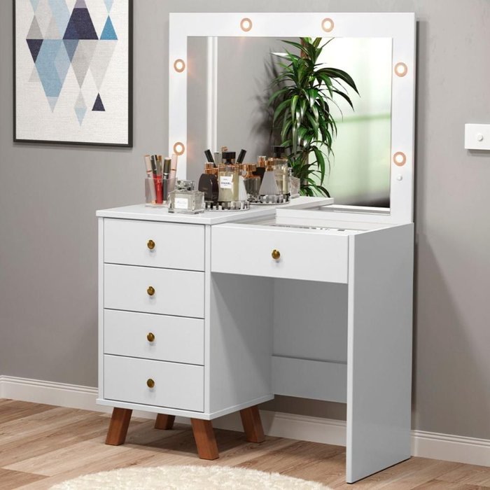 Essa Penteadeira é tudo o que você precisa para se arrumar com estilo, elegância e conforto. Proporcionando organização e facilidade para o seu momento de beleza. Feito em MDF. Contém 5 gavetas, espelho e suporte para soquetes (lâmpada). Não acompanha lâmpada. Descrição do produto: Altura: 142,5 cm Largura: 95 cm Profundidade: 44 cm Informações do produto: Cor: Branco Gavetas: Sim (5) Espelho: Sim (1) Material: MDF Itens inclusos: 01Penteadeira Camarim com Banqueta. Kit completo para montagem, manual detalhado de instruções para montagem. Garantia: 3 meses contra defeito de fabricação.