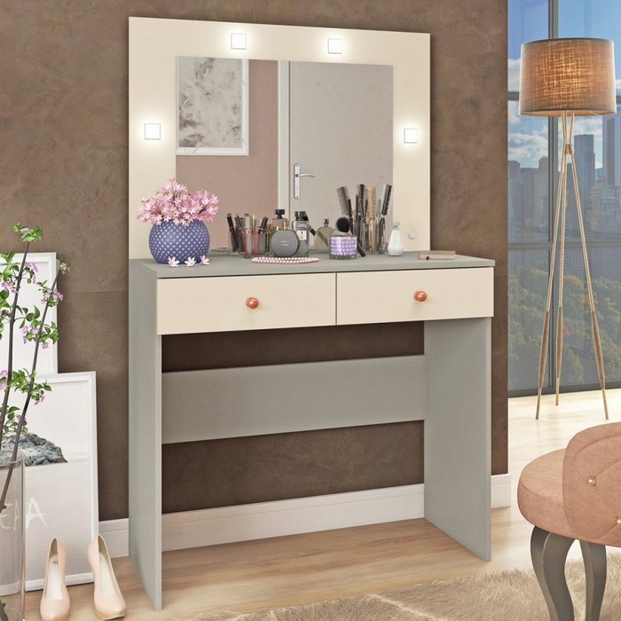 Penteadeira Camarim Maia 2 Gavetas com Espelho e Led Cinza/Champagne - Fellicci