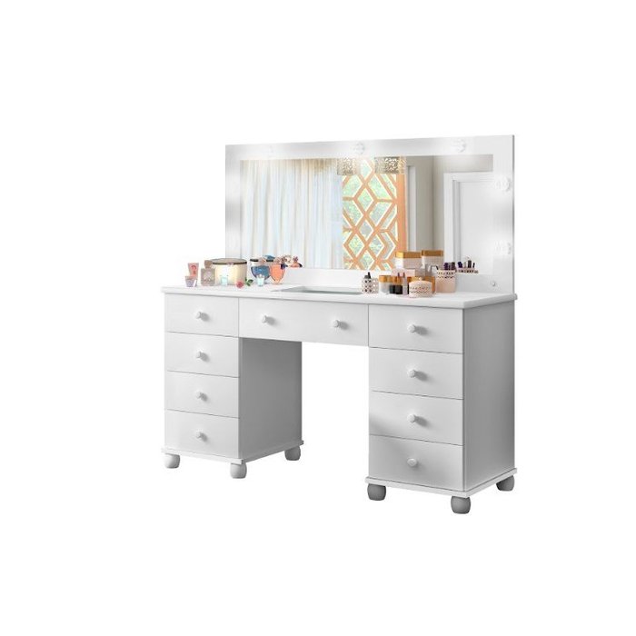 Tenha uma experiência de maquiagem como uma estrela de Hollywood com nossa incrível penteadeira! Com nove gavetas espaçosas, você terá espaço suficiente para armazenar todos os seus produtos de beleza e acessórios. A iluminação LED embutida e o espelho grande proporcionam uma iluminação perfeita para você se maquiar com precisão e facilidade.