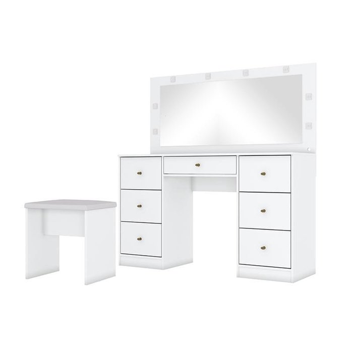 A Penteadeira Primor é sinônimo de elegância. Com design moderno ela é perfeita para você. Ela conta com 7 amplas gavetas, sendo a superior central com divisórias, auxiliando a organização de seus pertences. Conta ainda com 8 spots de LED, corrediças telescópicas e puxadores na cor dourado. Transforme seu ambiente com a Penteadeira Primor. Já a Banqueta Taia é ideal para compor seu espaço com seu design clean e sofisticado. Torne seu momento de auto cuidado mais prático e confortável com a Penteadeira Primor e Banqueta Taia.