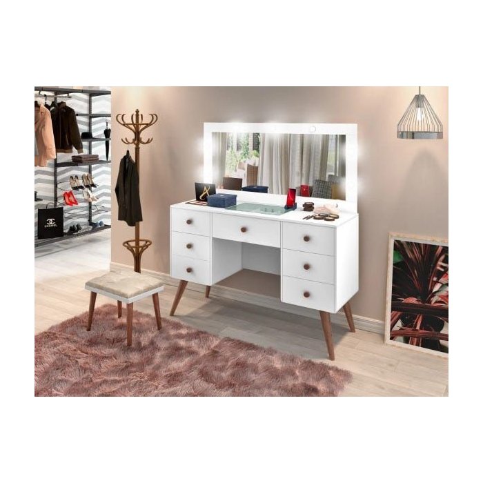 Penteadeira Camarim Retro 7 Gavetas com Led+banqueta Potente:branco Branco