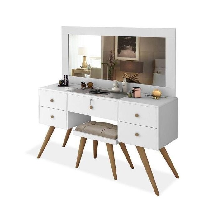 Penteadeira Camarim Retrô com Espelho, Porta Objetos e Banqueta Nevada Branco