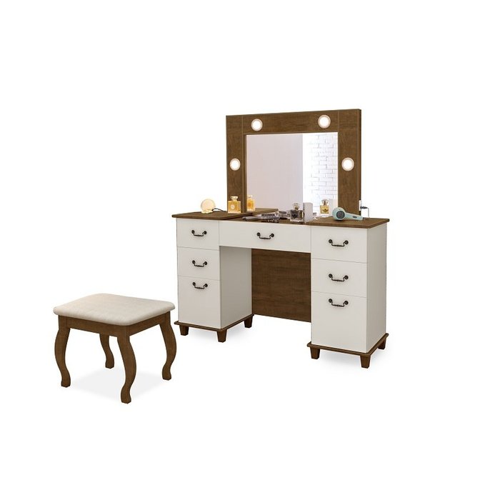 Penteadeira Camarim Seul com banqueta e UsbToda Mulher sonha em ter uma penteadeira linda pra guardar as maquiagens e acessórios não é? Pensando nas mulheres essa penteadeira foi desenvolvida com muita beleza e praticidade. Linda e com ótimo espaço para seus produtos de beleza, conta com sete gavetas com corrediça telescópica, espelho e iluminação em LED, esta linda penteadeira possui o tamanho exato para que tenha sempre a mão tudo o que precisar. MDP/MDF Gavetas com corrediça telescópica Gaveta com colméia Puxadores retrô 04 Soquetes para lâmpadas (lâmpadas não inclusa) Amplo espelho frontal Banqueta inclusa