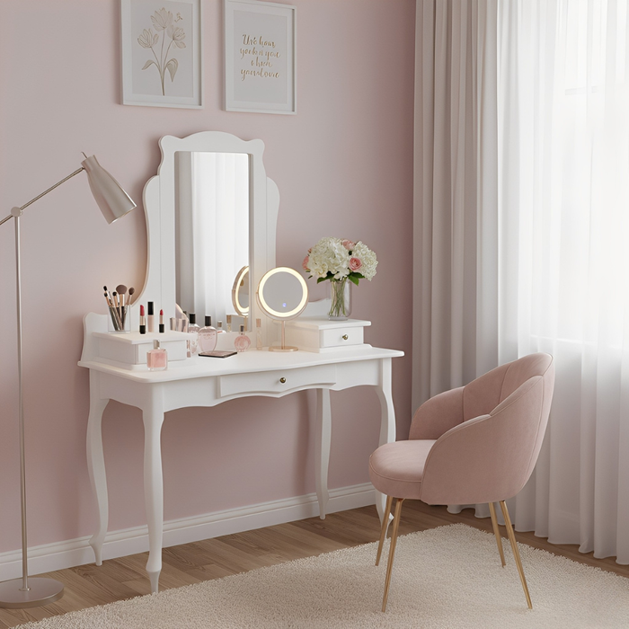 Quem nunca sonhou em ter uma penteadeira só sua para encher com seus mimos de beleza? A Penteadeira Pincess sem Banqueta é ideal para quem tem espaços pequenos mas já é grande :P Feita para mulheres adultas, a Penteadeira Pincess sem Banqueta possui duas gavetas pequenas para organizar suas sombras, jóias, pigmentos, acessórios de cabelo e uma gaveta maior onde você pode guardar suas paletas, pós, bronzers, entre outros acessórios e maquiagens