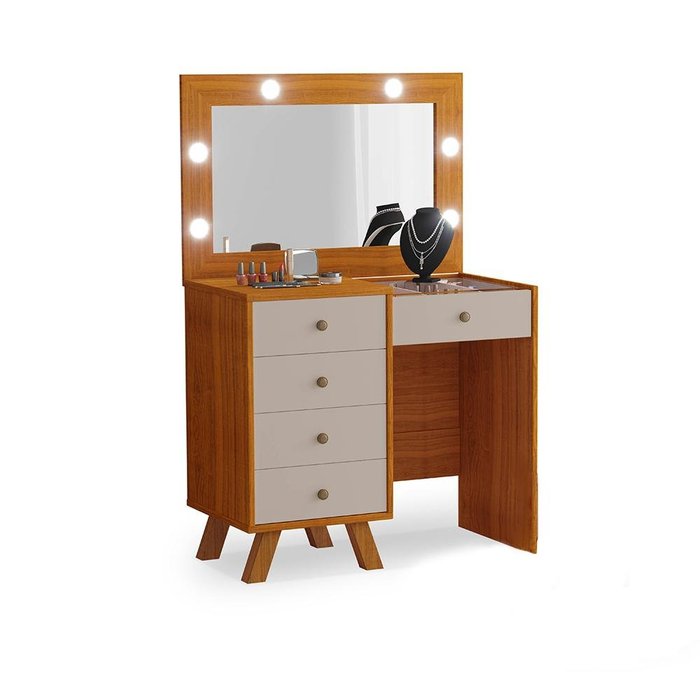 Essa Penteadeira conta com um design clássico e compacto, mas ainda assim moderno, somando na decoração de seu quarto ou closet, sendo o espaço perfeito para organização pessoal. Conta com um espelho com quadro iluminado por LED e gavetas laterais. Não acompanha banqueta. A Penteadeira é feita em MDF. Medidas da Penteadeira: Altura: 145 cm Largura: 93.5 cm Comprimento: 43 cm Informações da Penteadeira: Cor: Freijó Maní Material: MDF Gavetas: Sim, (5) Pés: Sim, (4) Itens Inclusos: 1 Penteadeira Manual de Montagem Kit completo para montagem e manual de instruções Garantia: 3 meses contra defeito de fabricação Informações Adicionais: - Fotos meramente ilustrativas do produto no ambiente. - Os objetos que ambientam as fotos não acompanham o produto; - Verificar descrição e tamanho do produto antes da compra. - Avaliar a mercadoria no ato do recebimento e recuse em caso de divergência ou avarias. - Mantenha as informações de contato e endereço de entrega atualizados para entrarmos em contato caso necessário. - Limpar com flanela ou pano macio seco, não utilizar produtos abrasivos, desengordurantes, álcool ou solvente. Não expor o produto diretamente à luz solar e à umidade. - Sugerimos a contratação de um montador profissional para a montagem do produto. Não nos responsabilizamos por avarias causadas no ato da montagem. - Não nos responsabilizamos pela montagem e desmontagem do produto no ato da entrega e devolução, assim como os custos gerados nestas situações. - A transportadora entregará o produto no andar térreo do endereço de entrega. - Não nos responsabilizamos por subir escadas, corredores e elevadores ou transporte por guincho em apartamentos.