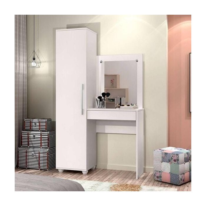 CaracterísticasItens inclusos: 1 Penteadeira com armário multiusoDimensões do produto: Largura 0,99M; Profundidade 0,35M; Altura 1,65M.Descrição TécnicaMaterial: MDPPenteadeira com armário multiuso embutidoPenteadeira com espelho e gaveta para melhor organizaçãoArmário multiuso com 5 prateleiras 4 pésComplexidade da montagem: Média, pode ser montado por apenas uma pessoa e/ou necessite de maior conhecimento para montagemRecomendações de uso, manutenção e limpeza: Limpar com flanela ou pano macio seco, não utilizar produtos abrasivos, desengordurantes, álcool ou solvente. Não expor o produto diretamente a luz solar e à umidadeGarantia : 3 mesesOBS: Foto meramente ilustrativa, decoração não faz parte do produto.