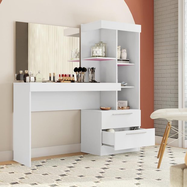 Com dupla funcionalidade a Penteadeira e Escrivaninha chegou para facilitar e organizar seu dia a dia. Ela possui espelho, 4 nichos e 2 gavetas para organizar seus perfumes, maquiagens e acessórios. Ao mesmo tempo, é escrivaninha para as horas de estudo ou home office.