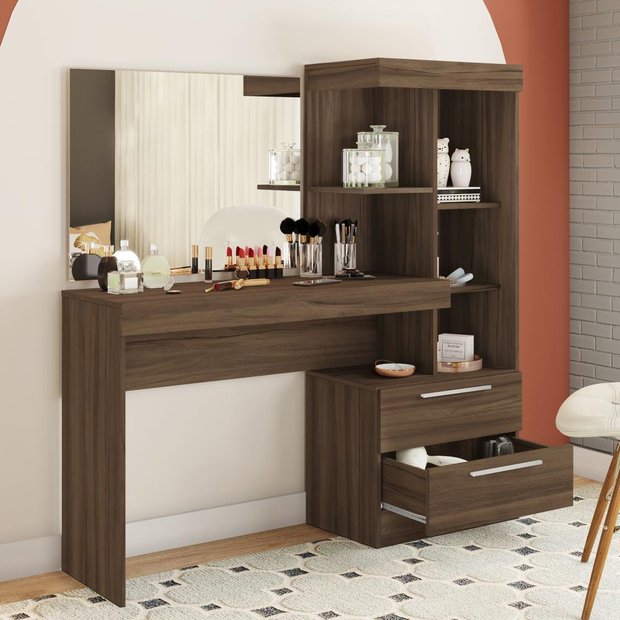 Com dupla funcionalidade a Penteadeira e Escrivaninha chegou para facilitar e organizar seu dia a dia. Ela possui espelho, 4 nichos e 2 gavetas para organizar seus perfumes, maquiagens e acessórios. Ao mesmo tempo, é escrivaninha para as horas de estudo ou home office.