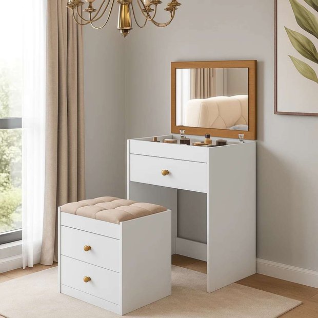 Penteadeira com Gavetas Espelho e Banqueta Branco/nature Olivia Mdf Branca
