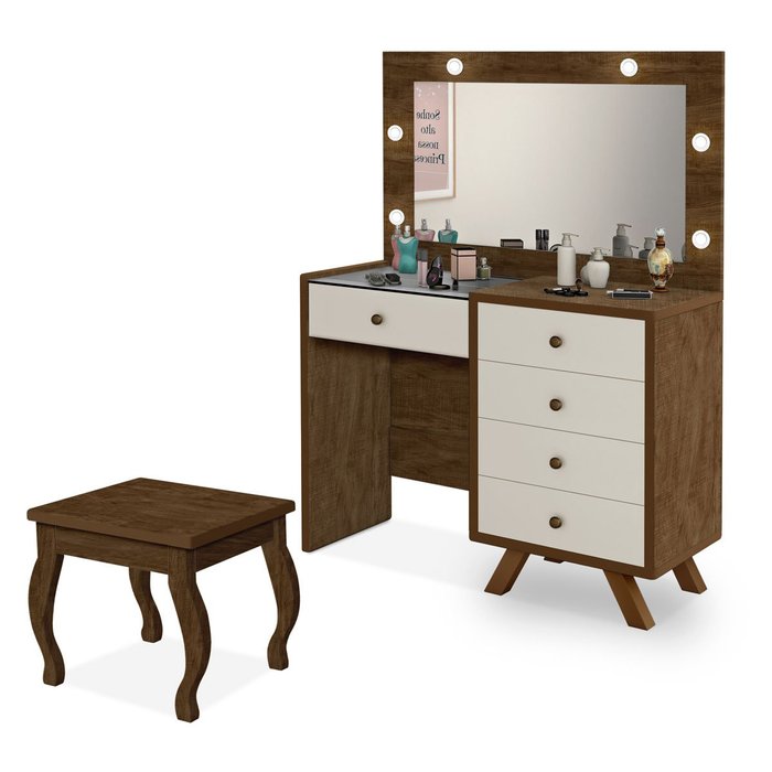 Penteadeira com Porta Joias 5 Gavetas e Banqueta Lótus Malbec/off White