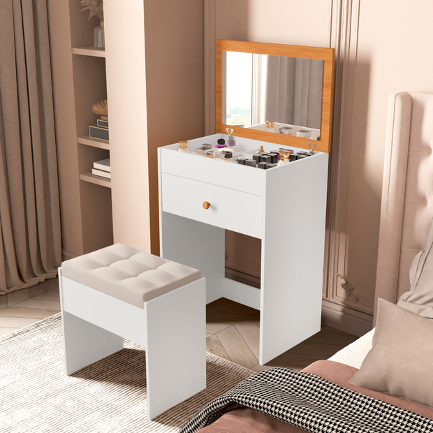 Chega de maquiagem espalhada e de se arrumar sem conforto! Esta penteadeira moderna e compacta foi pensada para você que busca praticidade e organização sem abrir mão do estilo. Com espelho, gaveta e banco inclusos, ela forma o conjunto perfeito para transformar um cantinho do seu quarto no seu próprio ambiente de beleza. Tudo ao alcance das mãos, de forma funcional e elegante.