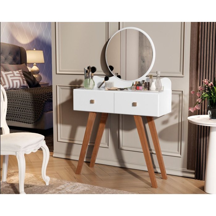 Penteadeira Condessa com Espelho Redondo com 2 Gavetas Pés Retrô para Quarto - Branco