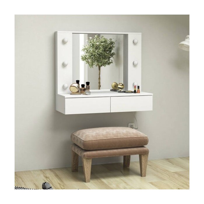 A Penteadeira de Parede com Espelho e 2 Gavetas Arujá vem com uma proposta mais ousada, para mulheres mais despojadas, mas que não abrem mão do cantinho mágico para a maquiagem. Possui soquetes que podem ser instaladas lâmpadas ao lado do espelho são ótimas para iluminar o seu rosto na hora de fazer a "make" sem fazer sombra, ela deve ser fixada na parede, deixando o espaço do chão livre. Se você tem pouco espaço e uma parede vaga, ela é perfeita! Além do mais você recebe um "chicote elétrico" que facilita a montagem da parte elétrica, evitando riscos de choque. Não acompanha lâmpadas.