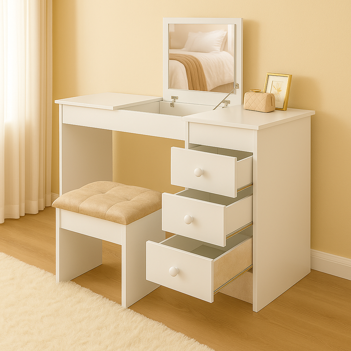- Design 2 em 1: Funciona como penteadeira e escrivaninha, perfeita para quartos e ambientes compactos.