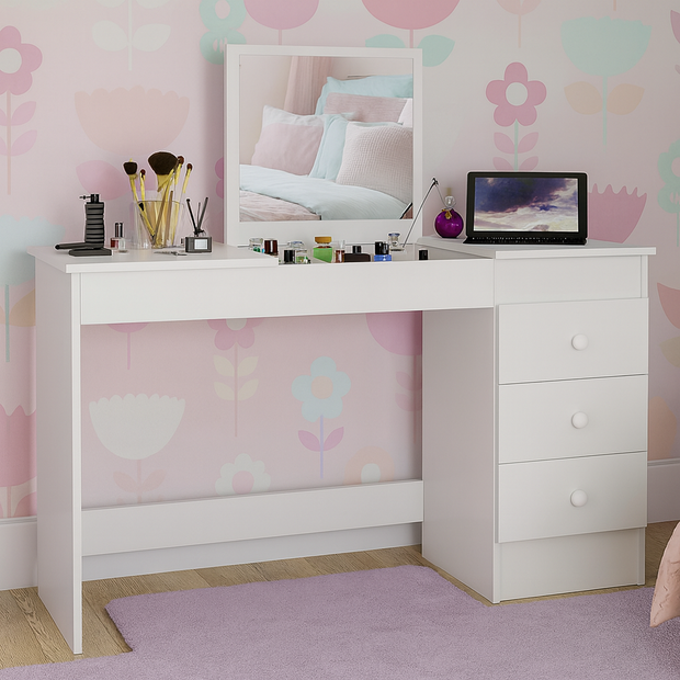 Escrivaninha Penteadeira Isadora 2 em 1 com Espelho e 3 Gavetas – Compacta e Versátil Transforme seu ambiente com elegância e praticidade! A Escrivaninha Penteadeira Isadora é a escolha perfeita para quem busca funcionalidade e estilo no mesmo móvel.